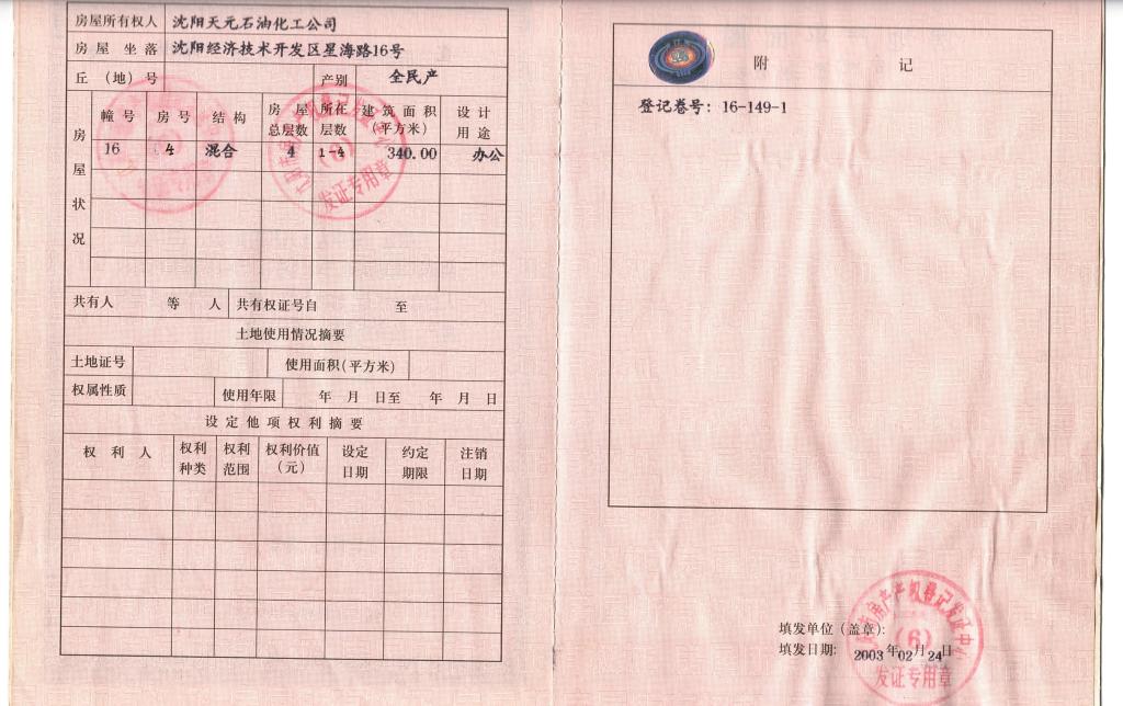 房屋产权证编号为沈房权证经济技术开发区字第002018号,证载权利人为沈阳天元石油化工公司,房屋建筑面积340㎡,混合结构,房产共4层,房屋设计用途为办公。该房产所在土地为共用土地,且已过使用年限,2018年天元公司改制由沈阳天元石油化工公司变更为沈阳天元石油化工有限责任公司,因土地无登记信息,房产与土地信息无法归集,不能换发不动产登记证并完成更名。因此目前仅有房屋产权证,证载权利人为沈阳天元石油化工公司。