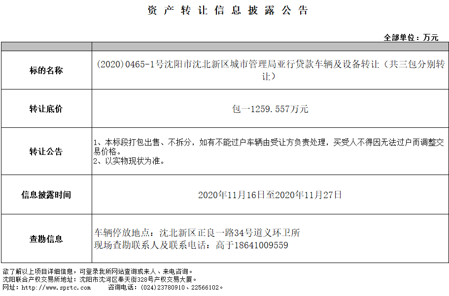 (2020)0465-1号沈阳市沈北新区城市管理局亚行贷款车辆及设备转让(共三包分别转让)