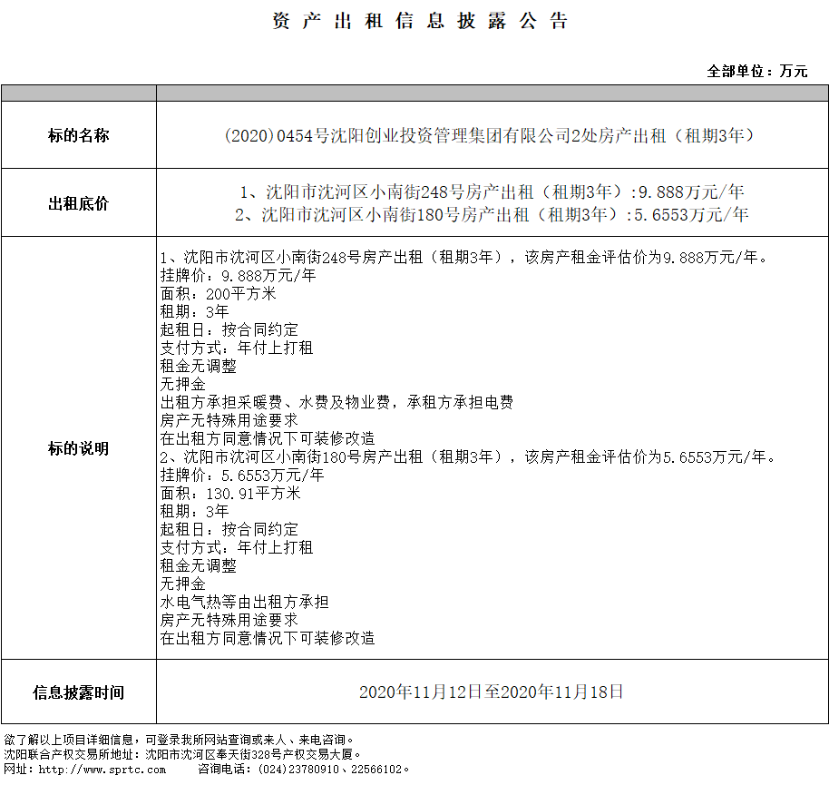 (2020)0454号沈阳创业投资管理集团有限公司2处房产出租(租期3年)