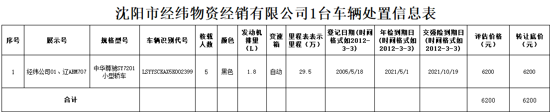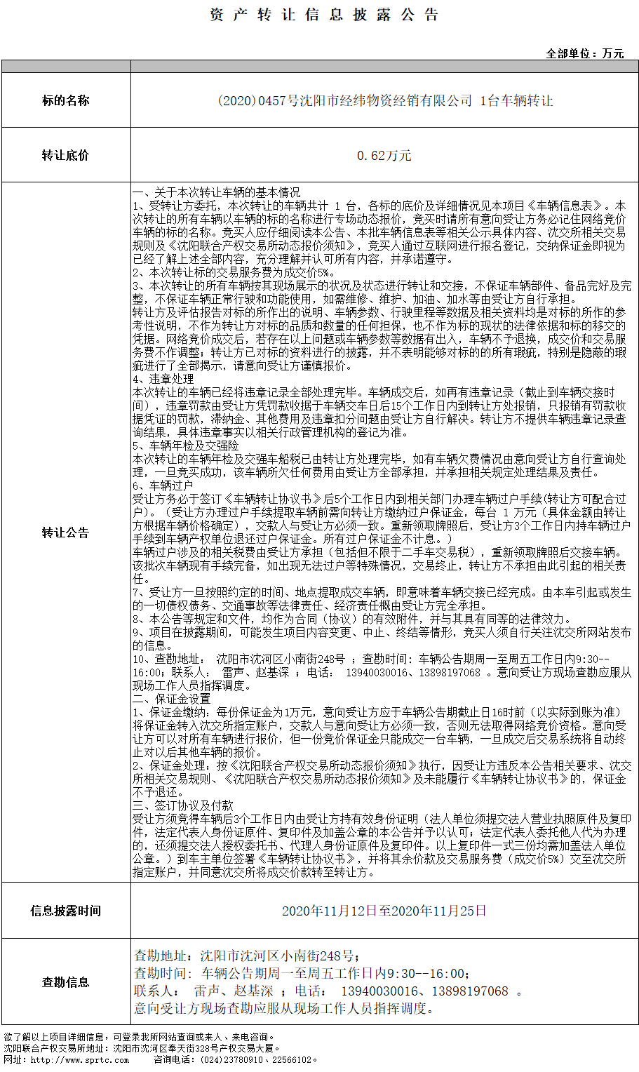 (2020)0457号沈阳市经纬物资经销有限公司 1台车辆转让
