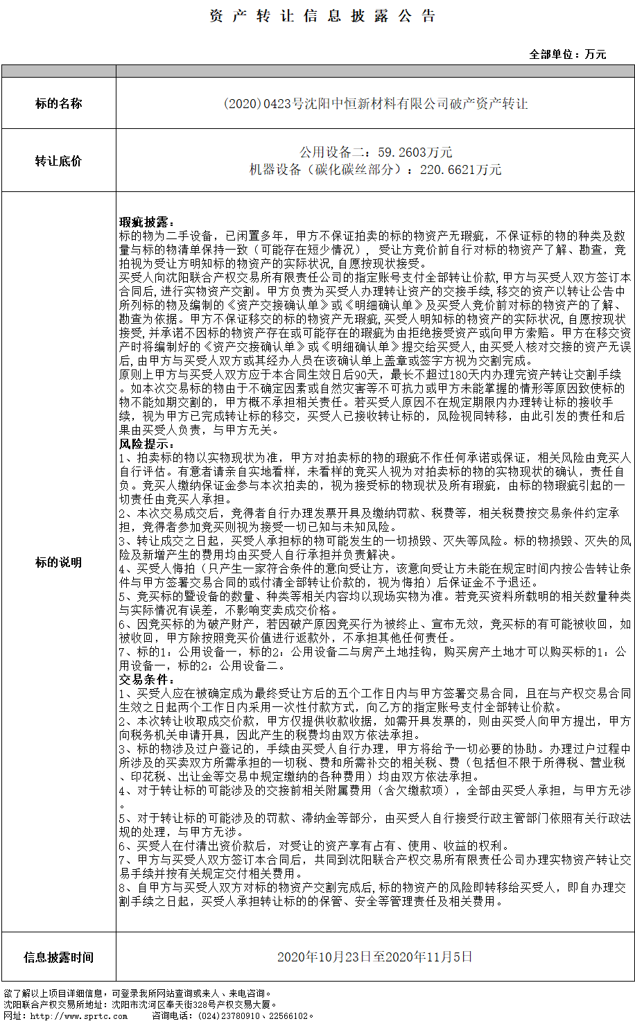 (2020)0423号沈阳中恒新材料有限公司破产资产转让