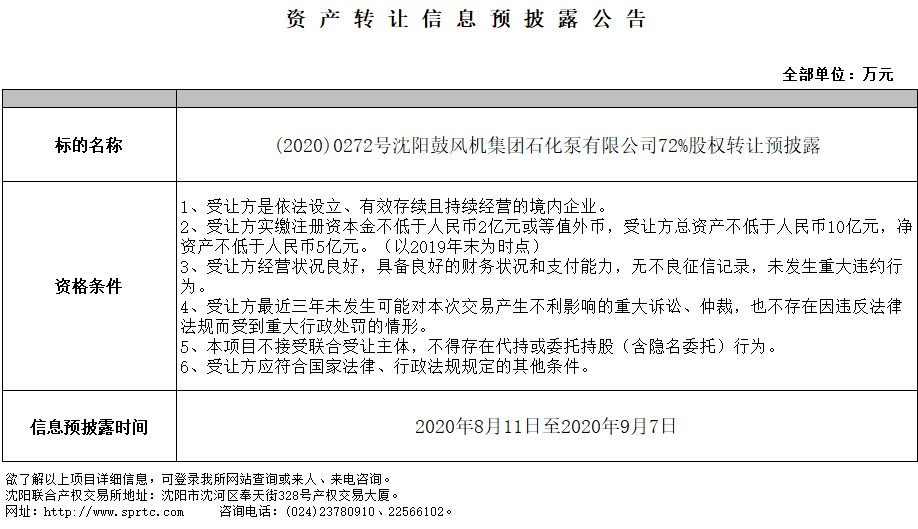 (2020)0272号沈阳鼓风机集团石化泵有限公司72%股权转让预披露