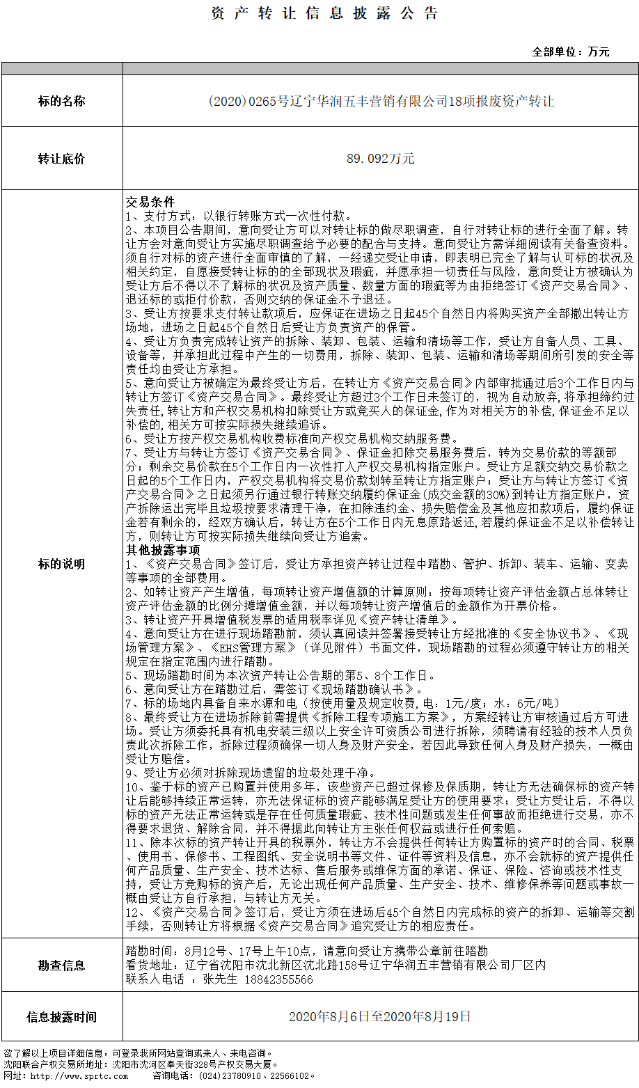 (2020)0265号辽宁华润五丰营销有限公司18项报废资产转让