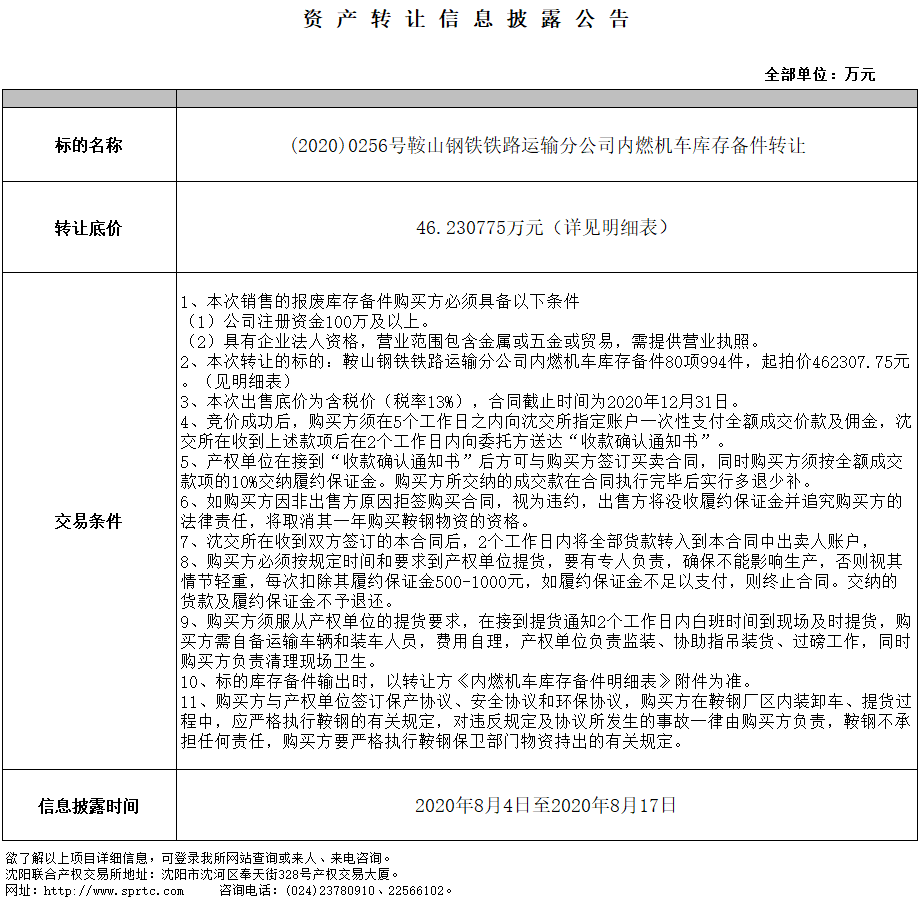 (2020)0256号鞍山钢铁铁路运输分公司内燃机车库存备件转让
