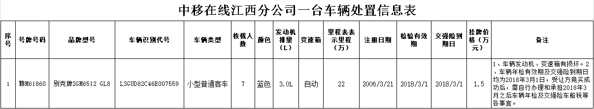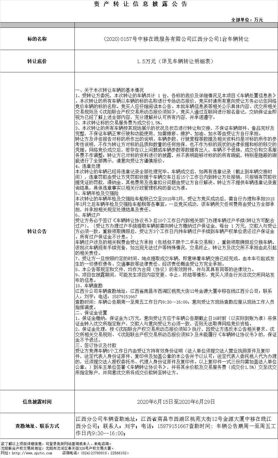 (2020)0157号中移在线服务有限公司江西分公司1台车辆转让