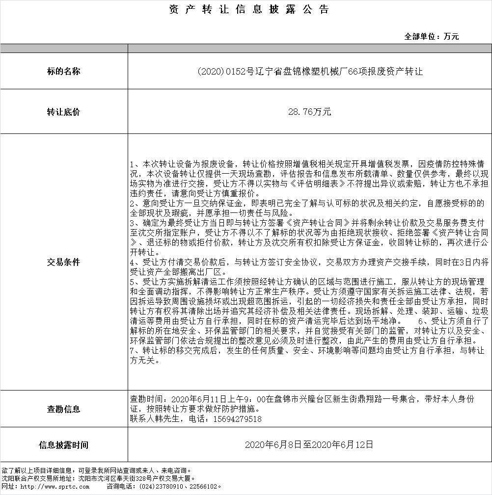 (2020)0152号辽宁省盘锦橡塑机械厂66项报废资产转让