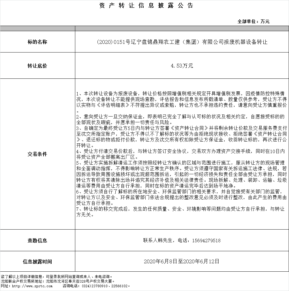 (2020)0151号辽宁盘锦鼎翔农工建(集团)有限公司报废机器设备转让