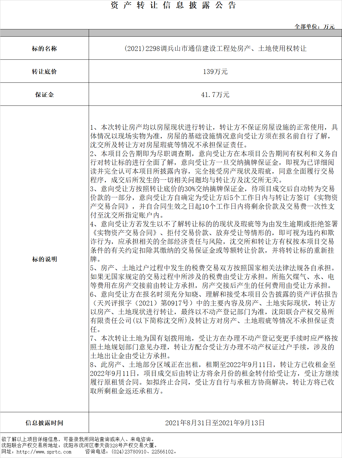 (2021)2298调兵山市通信建设工程处房产、土地使用权转让