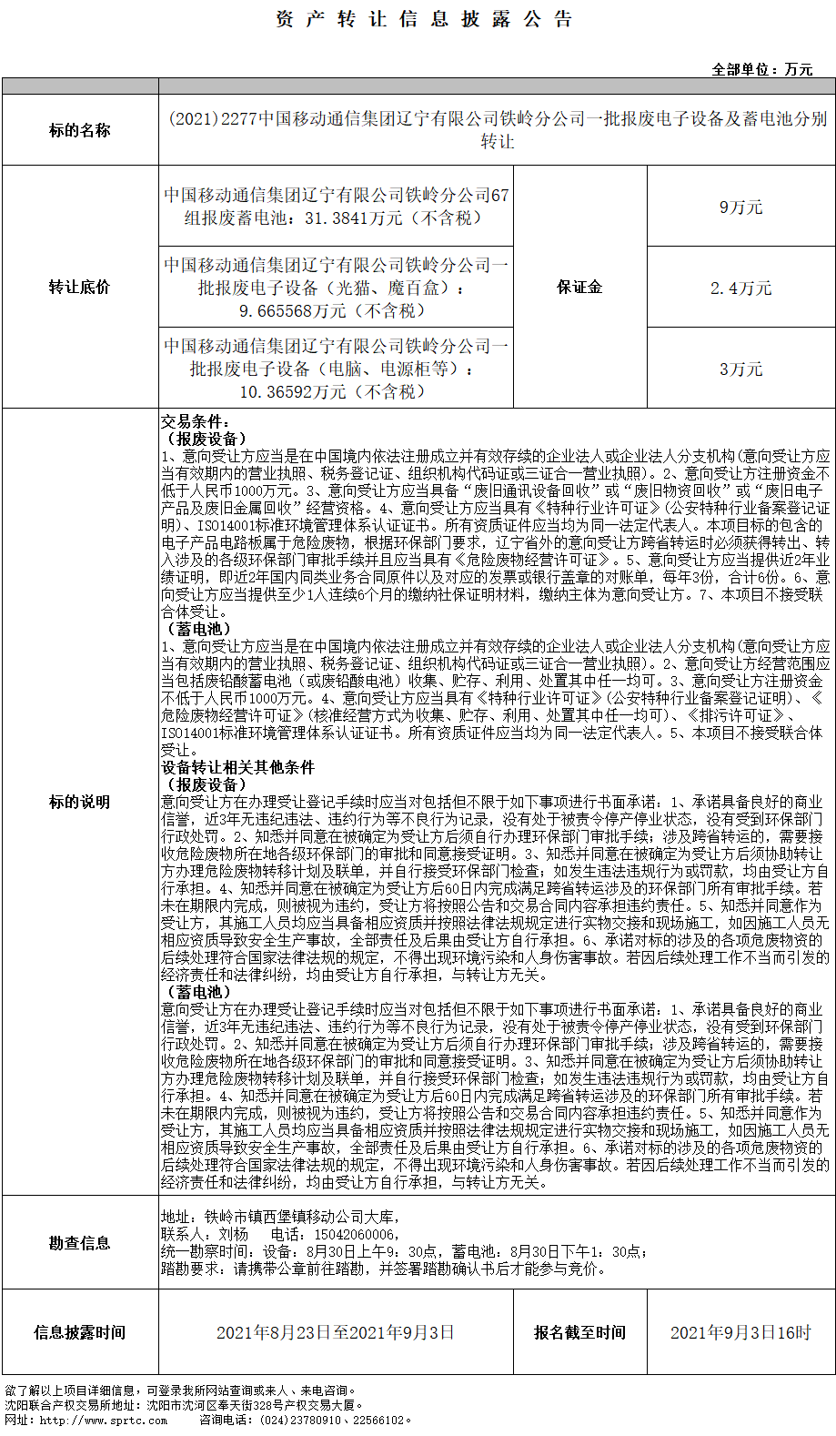 中国移动通信集团辽宁有限公司铁岭分公司一批报废电子设备(电脑、电源柜等)转让项目