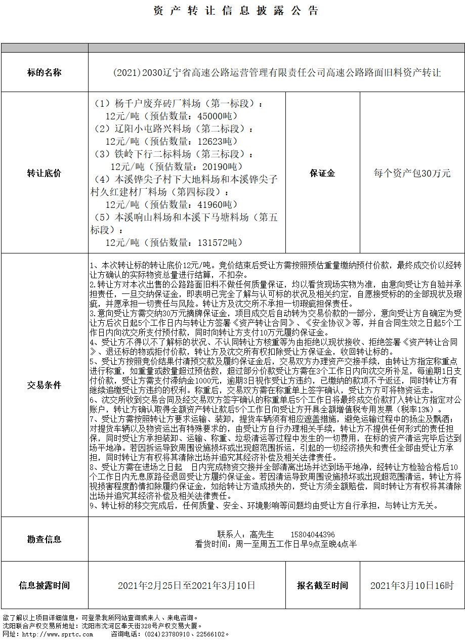 高速公路路面旧料资产转让 (第五标段本溪响山料场和本溪下马塘料场)